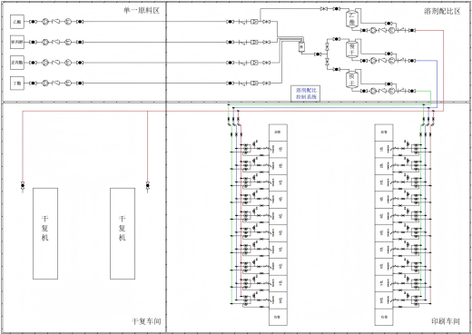 本系统是将“自动精确配比”与“管道安全输送”深度融合的自动化集成方案。它旨在将多种溶剂从储罐区开始,通过密闭管道网络,按预设配方进行精确混合,并安全、连续地输送到最终使用点。